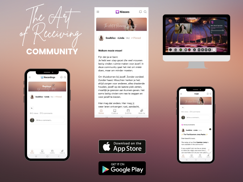 Maar je hoeft dit niet langer alleen te dragen. In The Art of Receiving community leer je wekelijks hoe je mag zakken uit die overlevingsstand. Hoe je lichaam ontspant, je grenzen voelbaar worden en je eindelijk weer ademruimte ervaart.
